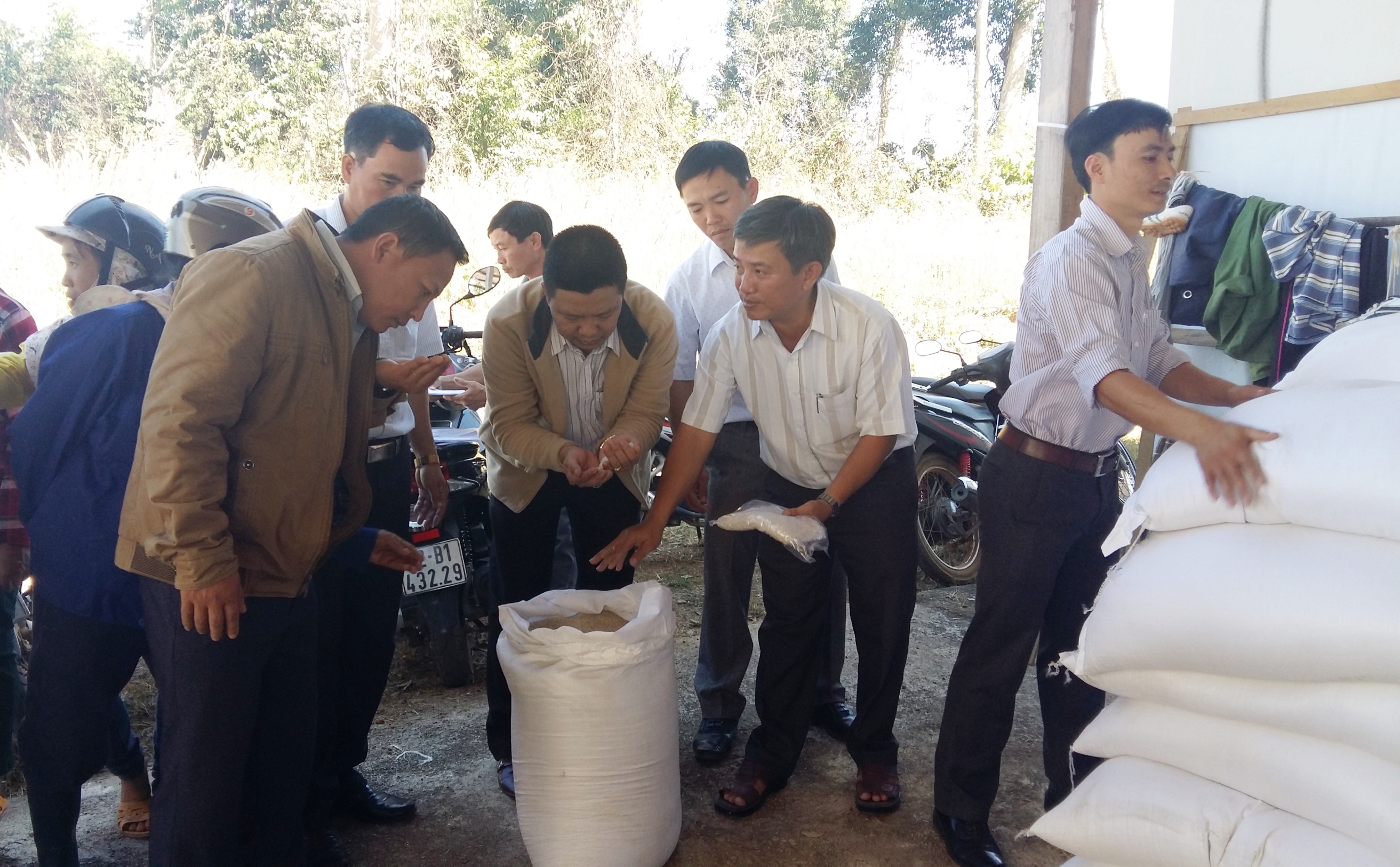 Lãnh đạo Sở LĐTBXH tỉnh Kom Tum kiểm tra chất lượng gạo. Ảnh: VGP/Dương Nương