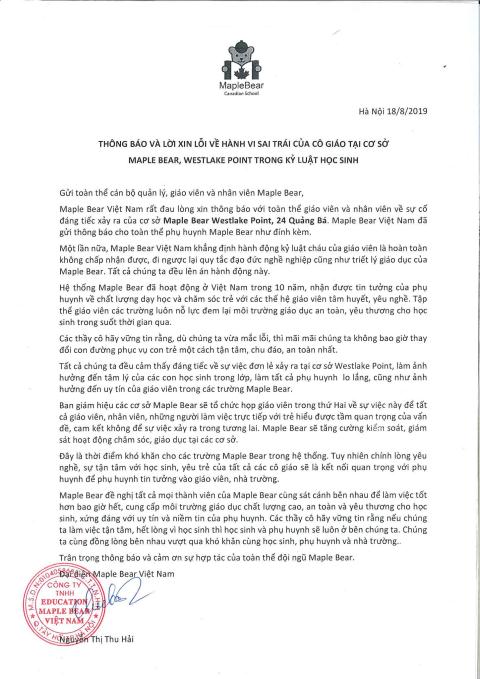 Ngay sau đó (18/8), trên trang web chính thức của trường mầm non Canada Maple Bear đã phát đi thông báo và lời xin lỗi về hành vi sai trái của cô giáo tại cơ sở Maple Bear Westlake Point trong kỷ luật học sinh. Theo thông báo, lãnh đạo trường mầm non Canada Maple Bear đã họp và xử lý kỷ luật cô giáo ở mức cao nhất là sa thải.