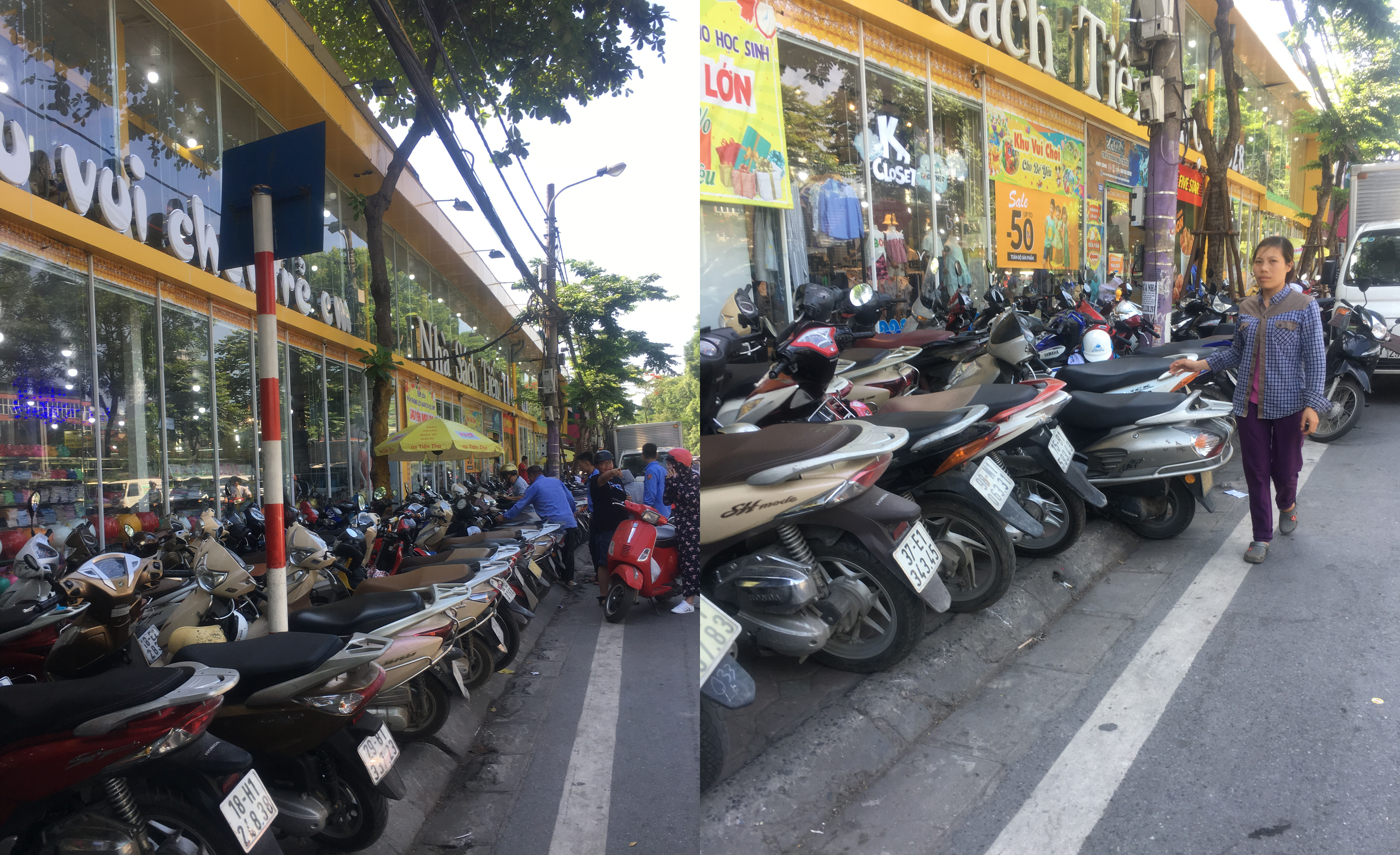 Nhân viên Nhà sách Tiến Thọ thường xuyên xếp xe của khách tràn xuống cả lòng đường gây mất mỹ quan đô thị