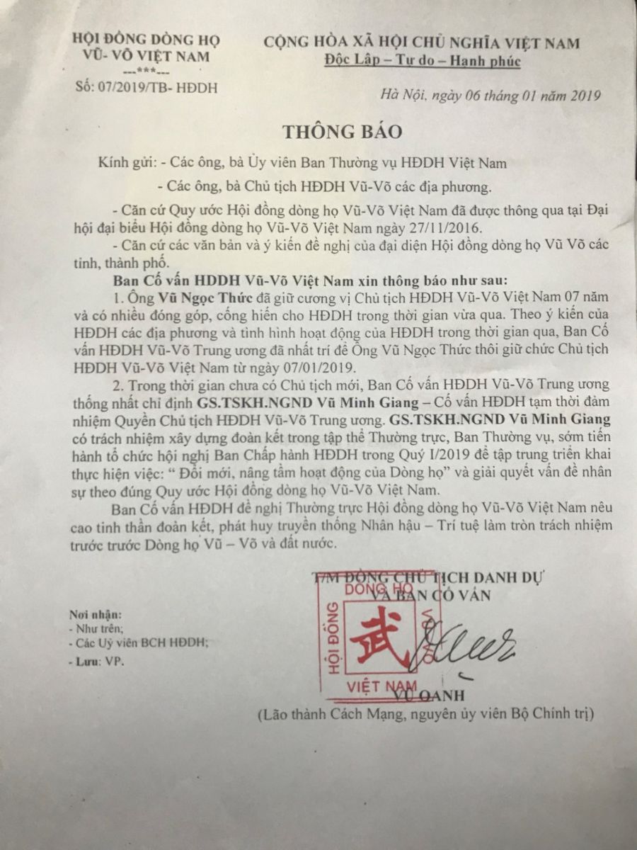 | Bản Thông báo ngày 06/01/2019 của HĐDH Vũ - Võ Việt Nam. |