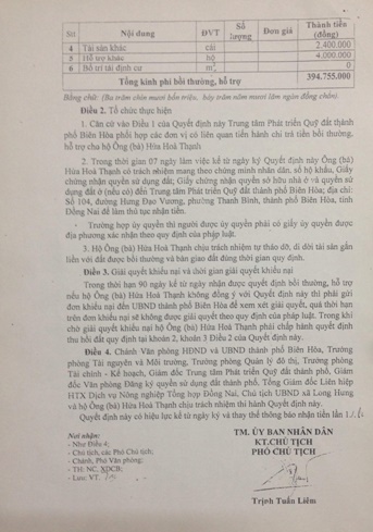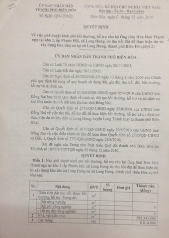 Tương tự trường hợp của ông Lê Quang Hiếu, ông Hứa Hòa Thạnh - một hộ dân cũng nằm trong diện bị thu hồi đất cho hay, quyết định phê duyệt kinh phí bồi thường, hỗ trợ cho gia đình ông được ban hành từ năm 2010 nhưng đến nay vẫn áp dụng. Theo đó, việc chi trả tiền bồi thường nhà cửa, đất đai, cây cối, hoa màu, công trình xây dựng và các khoản bồi thường khác cộng lại chưa đến 395 triệu đồng. Ông Thạnh bức xúc: “Năm nay là 2016, giá đền bù và giá cả thị trường trong 6 năm qua thay đổi đến chóng mặt nhưng UBND thành phố Biên Hòa vẫn đền bù theo khung giá cũ được xây dựng theo quyết định ban hành từ năm 2010 khiến người dân hết sức thiệt thòi. Thử hỏi gia đình tôi sống ra sao với số tiền ít ỏi như vậy…”