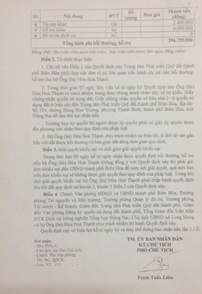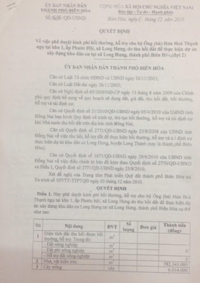 Tương tự là trường hợp của gia đình ông Hứa Hòa Thạnh - một hộ dân cũng nằm trong diện bị thu hồi đất, theo phương án chi tiết hỗ trợ bồi thường của Hội đồng Bồi thường phê duyệt năm 2010, gia đình ông Thạnh chỉ được bồi thường hơn 150m2 nhà cấp 4 theo đơn giá là 1.220.000 đồng/m2; những hạng mục công trình, cây cối còn lại cùng trên một thửa đất chỉ được đền bù với giá rất rẻ. Ông Thạnh bức xúc: “Năm nay là 2016, giá đền bù và giá cả thị trường trong 6 năm qua thay đổi đến chóng mặt nhưng UBND thành phố Biên Hòa vẫn đền bù theo khung giá cũ được xây dựng theo quyết định ban hành từ năm 2010 khiến người dân hết sức thiệt thòi. Thử hỏi gia đình tôi sống ra sao với số tiền ít ỏi như vậy…”.