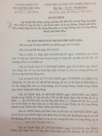 Quyết định cưỡng chế thu hồi đất của UBND thành phố Biên Hòa.