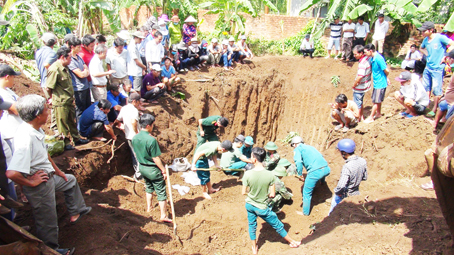 Người dân cho biết, chiều 9-9, khi thuê xe cuốc đào san lấp khu đất trồng cây lâu năm của gia đình, ông Kính và anh Nguyễn Văn Nam (người điều khiển xe cuốc) phát hiện có bạt ny-lông và xương cốt người lộ ra. Nghi đây là mộ liệt sĩ, ông Kính đã trình báo UBND xã.