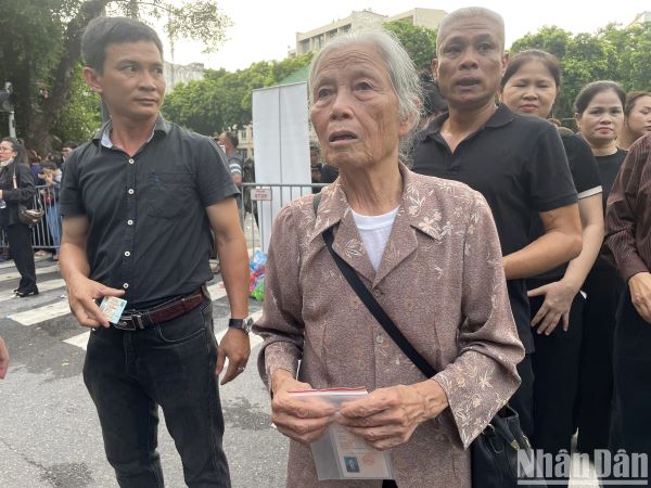 Là một trong những người dân đến viếng, bà Ngô Thị Quý năm nay 75 tuổi, từng là y sĩ của Viện Pasteur Trung ương (nay là Viện Vệ sinh Dịch tễ Trung ương). Bà đến từ sáng sớm nhưng chưa có cơ hội được vào thắp nén nhang. Mặc dù vừa có cơn mưa lớn, song bà Quý cùng nhiều người dân vẫn ở lại khu vực chờ, mong mỏi được kính viếng Tổng Bí thư.