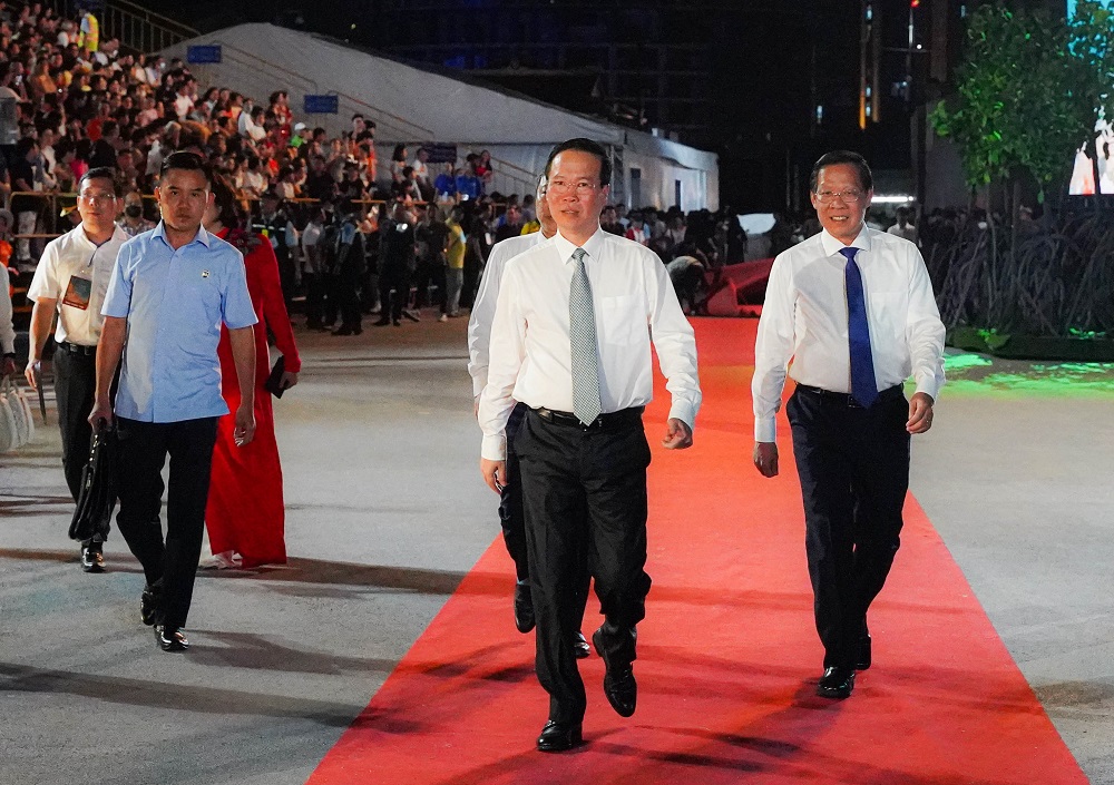 Chủ tịch nước Võ Văn Thưởng (ở giữa) cùng Chủ tịch UBND TP Hồ Chí Minh tiến về khán đài tham dự chương trình nghệ thuật.