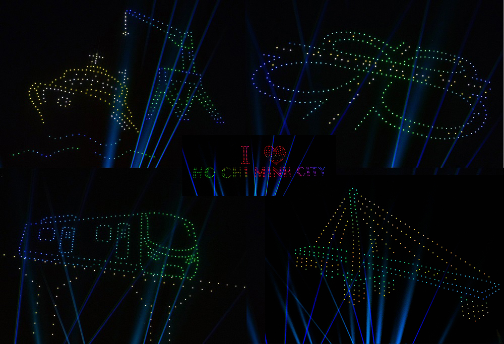 Hàng trăm máy bay Drone đồng diễn các công trình, kiến trúc hiện đại, mang dấu ấn hội quốc tế của Thành phố: Cầu Ba Son; Hầm sông Sài Gòn; Cầu Ánh Sao - Quận 7; TP Thủ Đức; Tuyến Metro số 1...