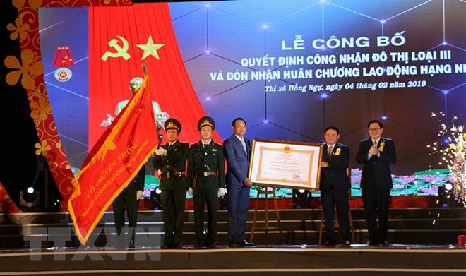 | Thị xã Hồng Ngự, tỉnh Đồng Tháp vinh dự đón nhận Huân chương Lao động hạng Nhất. (Ảnh: Chương Đài/TTXVN) |