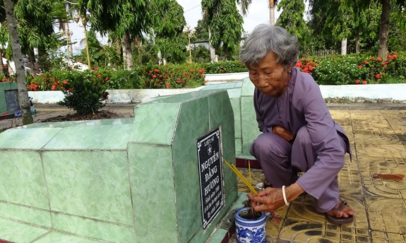 Cứ vài ngày là bà lại tới Nghĩa trang để quét dọn, lau chùi các ngôi mộ. Với bà Bảy, đây chính là niềm vui cũng là tâm niệm của bà là sẽ chăm lo hương khói cho đồng đội đến cuối đời