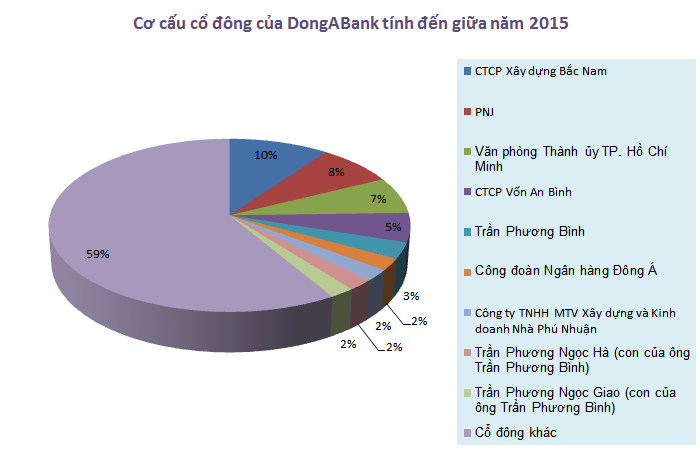 Tính đến giữa năm 2015, 4 cổ đông lớn nắm giữ trên 5% vốn điều lệ của DongA Bank là CTCP Xây dựng Bắc Nam (10%), PNJ (7.7%), Văn phòng Thành ủy TP. Hồ Chí Minh (6.87%), CTCP Vốn An Bình (5.42%).
