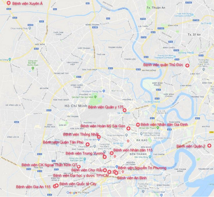 Bản đồ các bệnh viện có khả năng điều trị đột quỵ cấp trên địa bàn Tp Hồ Chí Minh.