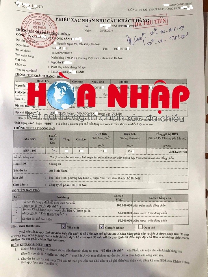 Phiếu xác nhận của khách hàng khi nộp tiền mua căn hộ tại dự án An Bình Plaza