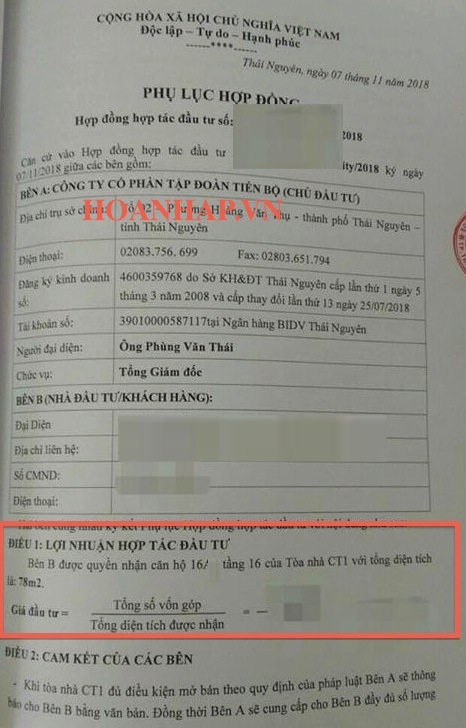 Theo tài liệu PV có được, để né tránh việc thực hiện hợp đồng mua bán nhà khi chưa đủ điều kiện, chủ đầu tư đã cho lập hợp đồng theo hình thức “Hợp đồng Hợp tác đầu tư” cho dự án. Hợp đồng hợp tác đầu tư này do ông Phùng Văn Thái, Tổng giám đốc của TTB Group ký tên và đóng dấu.