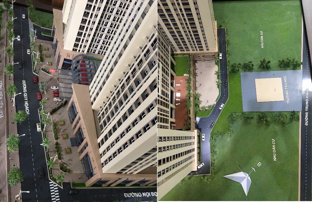 Mô hình quy hoạch của dự án thể hiện rõ: Phần công trình khu Nhà ở cao tầng kết hợp TTTM, văn phòng cho thuê có lối đi phía đường quy hoạch 21m lối Nguyễn Chánh; còn phần công trình Trường Tiểu học có lối đi tại số 177 Trung Kính.