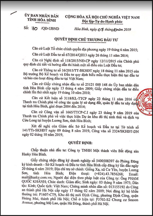 Ngay sau đó ngày 7/10/2019 UBND tỉnh Hòa Bình ra quyết định số 70/QĐ – UBND ‘Quyết Định Chủ Trương Đầu Tư’ chấp thuận nhà đầu tư là Công ty TNHH Một thành viên Bất động sản Hasky Hòa Bình thực hiện dự án nêu trên (lúc này Chủ đầu tư là một doanh nghiệp khác không phải là Công ty Cổ phần Hasky mà là Công ty TNHH MTV Bất động sản Hasky Hòa Bình – Hai tư cách pháp nhân hoàn toàn độc lập). Trong quyết định này tên dự án cũng có phần điều chỉnh, được bổ sung thêm cụm từ “Dự án hạ tầng” thành “Dự án hạ tầng khu đô thị sinh thái và dịch vụ Cửu Long” – Đây là một quyết định chủ trương mới chứ không phải là điều chỉnh chủ trương đầu tư.