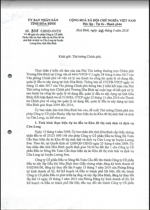Tiếp đến ngày 6/3/2018, UBND tỉnh Hòa Bình có Công văn số: 35/UBND – NNTN gửi Thủ tướng Chính phủ về việc đề nghị cho phép Công ty cổ phần Hasky tiếp tục thực hiện dự án Khu đô thị sinh thái và dịch vụ Cửu Long tại huyện Lương Sơn, tỉnh Hòa Bình vì lý do không tìm được nhà đầu tư khác để tiếp tục thực hiện dự án. Trong công văn ghi rõ Công ty Cổ phần Đầu tư Sông Đà Toàn Cầu sau nhiều lần đổi tên, đến nay đổi tên thành Công ty Cổ phần Hasky đăng ký thay đổi lần thứ 20 ngày 29/7/2016 của Phòng đăng ký dinh doanh số 2, Sở KH&ĐT thành phố Hà Nội.