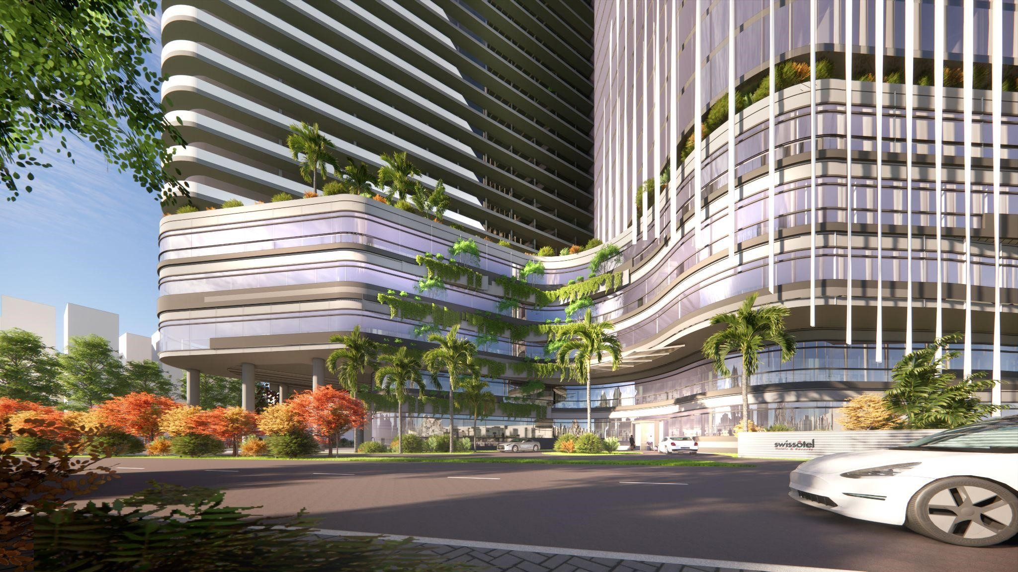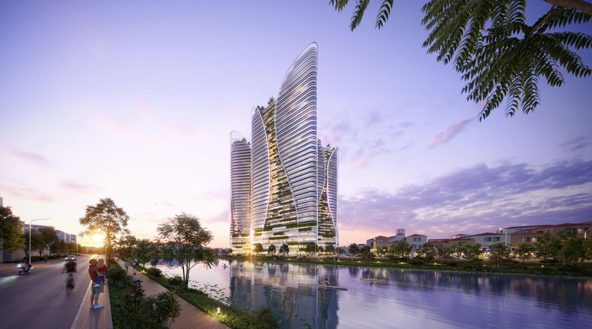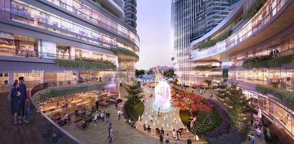 Phối cảnh khu vực quảng trường giữa hai tòa tháp với ý tưởng “Nơi hội tụ của các dòng sông”