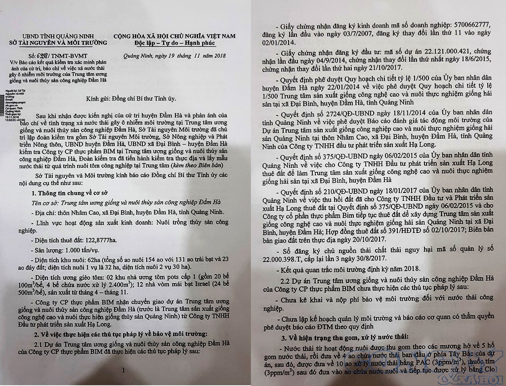 Không chỉ ngang nhiên xả thải hủy hoại môi trường biển, ngày 19/11/2018, ông Nguyễn Ngọc Thu, Giám đốc Sở TN&MT Quảng Ninh ký văn bản số 6998/TNMT-BVMT gửi Bí thư Tỉnh ủy Quảng Ninh Nguyễn Văn Đọc về việc báo cáo kết quả kiểm tra, xác minh phản ánh của cử tri về việc xả nước thải gây ô nhiễm của Trung tâm ương giống và nuôi thủy sản công nghiệp Đầm Hà.