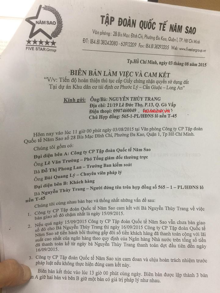 Trong quá trình thực hiện hợp đồng, bà Trang yêu cầu công ty Năm Sao cam kết thực hiện đúng cam kết hợp đồng 565-2-PL/HĐNS. Đến ngày 30/12/2014, sắp đến thời điểm công ty Năm Sao phải trả sổ đỏ, công ty Năm Sao ký phát cho bà Trang công văn 261/2014/FSG thông báo thời gian dự kiến hoàn tất giấy chứng nhận quyền sử dụng đất đến tháng 06/2015. Tuy nhiên, liên tiếp thất hứa về ngày bàn giao sau đó, công ty đã nhiều lần gửi đến bà Trang thông báo xin khất sổ đỏ tiếp theo: công văn số 144/2015/FSG thông báo dự kiến hoàn thất sổ đỏ đến tháng 08/2015, sau đó là công văn số 26/2014/FSG và 144/2015/FSG.