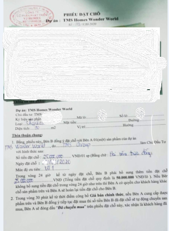 Tuy nhiên, dự án TMS Homes Wonder World đang được có dấu hiệu lách luật, huy động vốn trái phép dưới hình thức “Phiếu giữ chỗ”. Nhưng toàn bộ các điều khoản thỏa thuận không khác gì một hợp đồng, đồng thời, trong thỏa thuận này cũng thể hiện rõ tiền mua nhà đất, vị trí lô đất của dự án.