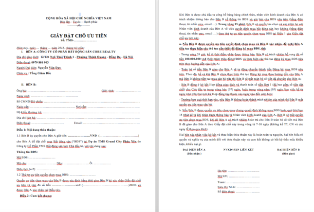 | Mẫu hợp đồng mà Chủ đầu tư cho nhân viên tư vấn sử dụng để mồi chài khách hàng mua dự án tại TMS Grand City |
