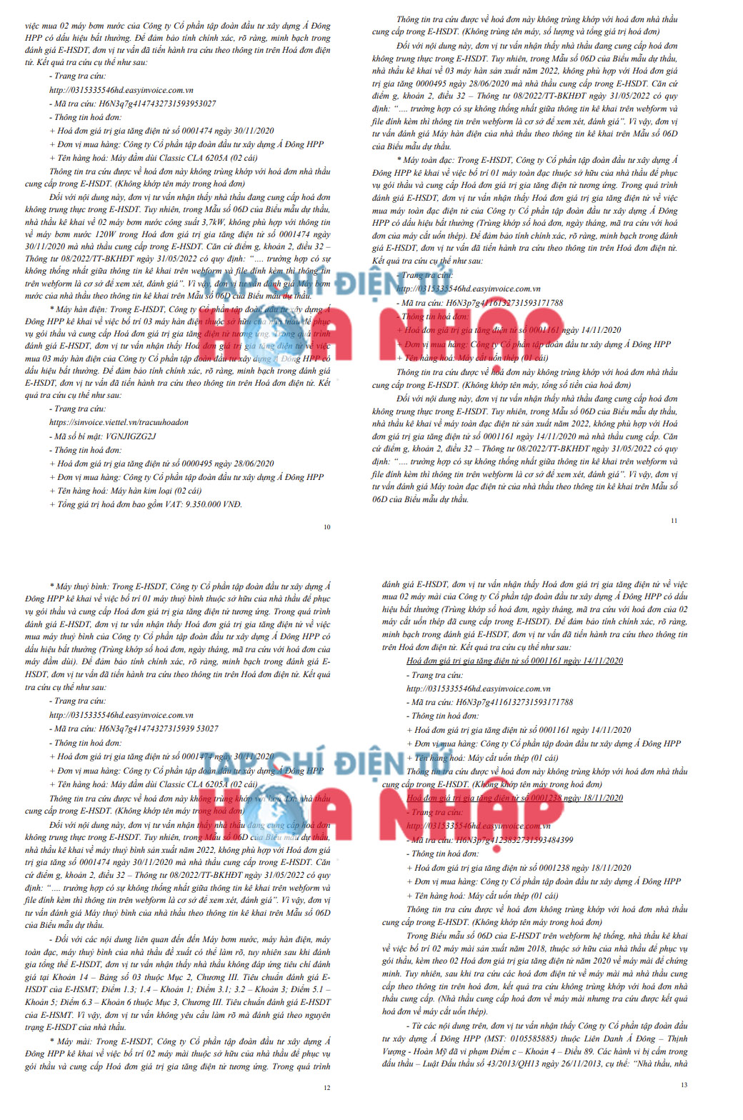 “Từ kết quả xác minh, Tổ chuyên gia nhận thấy Công ty CP Tập đoàn Đầu tư xây dựng Á Đông HPP đã vi phạm hành vi bị cấm trong đấu thầu, khi cung cấp các hóa đơn không trung thực tại HSDT, vi phạm điểm c Khoản 4 Điều 89 Luật Đấu thầu”, Tổ chuyên gia kết luận và kiến nghị Chủ đầu tư có văn bản báo cáo người có thẩm quyền xử lý nhà thầu vi phạm theo quy định pháp luật về đấu thầu.