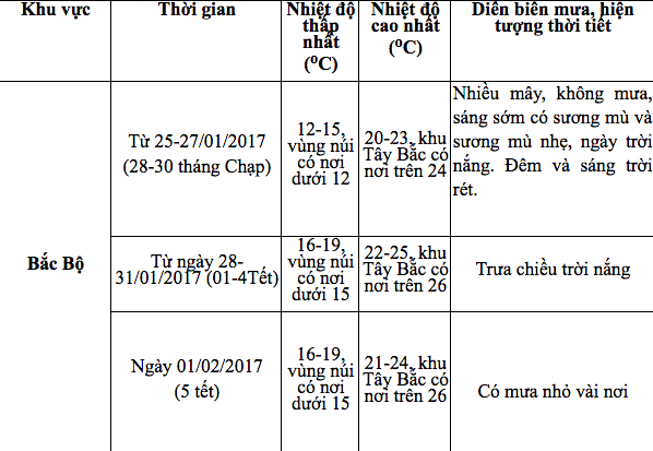 Các tỉnh miền Bắc: Ngày 25/01 và ngày 31/01 chịu ảnh hưởng của không khí lạnh được tăng cường nhưng hầu như không ảnh hưởng nhiều đến thời tiết khu vực. Trời rét về đêm và sáng sớm.