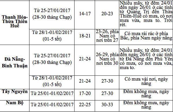 Các tỉnh miền Trung: Chịu ảnh hưởng của đới gió đông hoạt động yếu, trời có mưa rải rác, từ đêm 24/01 đến ngày 26/01 ở các từ Quảng Trị đến Phú Yên có mưa trên diện rộng, khu vực các tỉnh từ Thừa Thiên-Huế đến Bình Định có mưa vừa, mưa to. Phía Bắc trời rét.