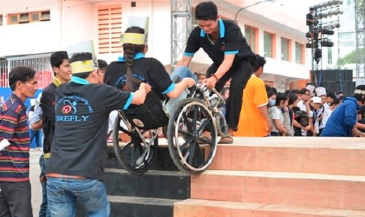 | Người khuyết tật cần người trợ giúp khi vượt qua các bậc tam cấp. |