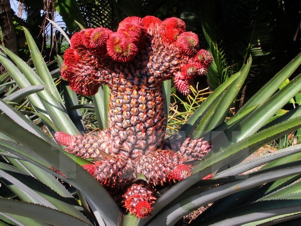 Quả dứa phụng được đánh giá là đẹp khi có phần đầu xòe to, đỏ rực như đuôi phụng, phần cuống có nhiều quả nhỏ bao quanh. (Ảnh: Xuân Dự/TTXVN)