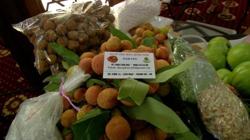 Quảng bá sản phẩm vải thiều tại Hội nghị. Ảnh: Hương thu/TTXVN