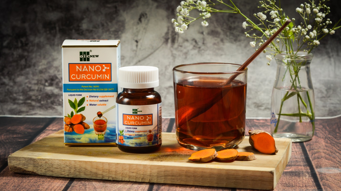 Thực phẩm bảo vệ sức khỏe Dung dịch Nano Curcumin OIC là sản phẩm nano curcumin đầu tiên trên thị trường được cấp Bằng độc quyền sáng chế. Bằng tác dụng hướng đích, dung dịch nano curcumin có tác dụng hỗ trợ chống viêm, chống oxy hóa mạnh, hỗ trợ tăng cường miễn dịch và tăng cường sức đề kháng; bảo vệ hệ tiêu hóa trước tác động của các yếu tố bên ngoài. Với kích thước hạt nano curcumin siêu nhỏ <39 nanomet, hòa tan hoàn toàn trong nước, đã được chứng minh làm tăng khả năng thẩm thấu và hiệu quả lên gấp hàng trăm lần so với sử dụng curcumin thông thường.