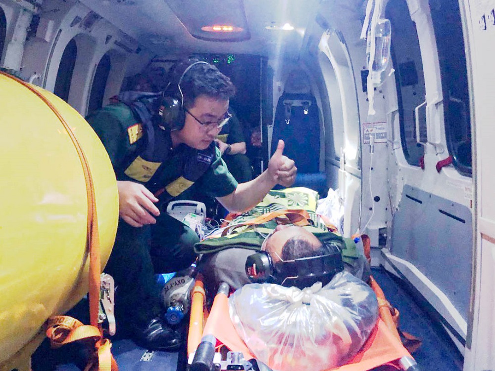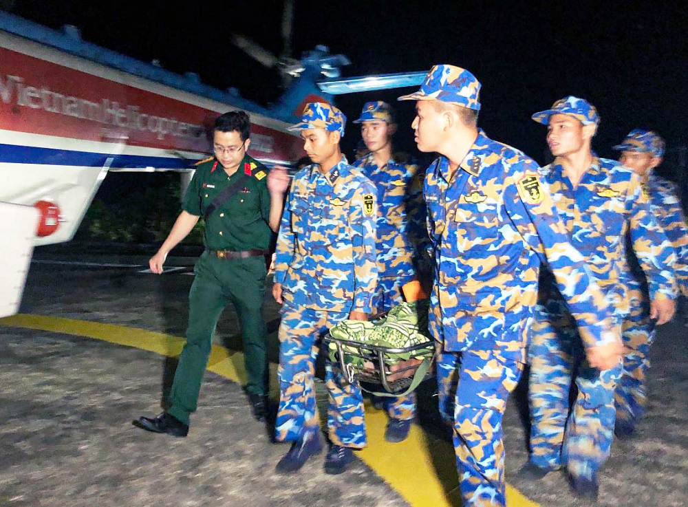 Được sự chỉ đạo kịp thời của Bộ Quốc phòng, Binh đoàn 18 đã điều trực thăng phối hợp với Tổ cấp cứu đường không Bệnh viện Quân y 175 do Thượng úy, bác sĩ Nguyễn Cảnh Chung - Khoa Hồi sức tích cực làm tổ trưởng bay ra đảo Sinh Tồn đưa bệnh nhân về đất liền.