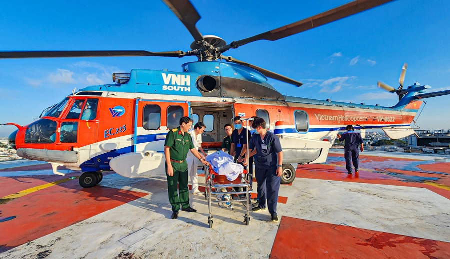Sau khi tiếp nhận bệnh nhân và di chuyển về đất liền, đến 6h25 ngày 15/8 chuyến bay đáp xuống nóc tòa nhà Viện Chấn Thương chỉnh hình an toàn, nhanh chóng đưa bệnh nhân vào trung tâm cấp cứu và tiến hành điều trị.
