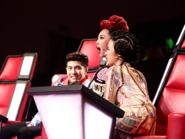 | Bốn huấn luyện viên lại nhào lên sân khấu trước màn biểu diễn cảm động của Ngọc Ny. (Ảnh: CTS) |