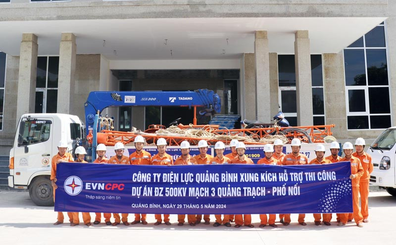 Nhằm hỗ trợ thi công dự án đường dây 500kV mạch 3 Quảng Trạch - Phố Nối, từ ngày 29/5-1/6, Công ty Điện lực (PC) Quảng Bình đã chi viện 2 đội xung kích với hơn 40 công nhân, kỹ sư, lái xe, nhân viên phục vụ cùng nhiều phương tiện, trang thiết bị chuyên dụng lên đường đến các vị trí thi công. Được biết, ngay sau khi có quyết định huy động lực lượng của Tổng công ty Điện lực miền Trung (EVNCPC) hỗ trợ thi công xây dựng dự án đường dây 500kV mạch 3 Quảng Trạch-Phố Nối, 2 đội xung kích của PC Quảng Bình cùng với 22 đội đến từ 13 công ty điện lực trực thuộc EVNCPC và công ty dịch vụ Điện lực miền Trung đã khẩn trương lên đường hỗ trợ tổng công ty truyền tải điện Quốc gia thực hiện nhiệm vụ "nước rút".