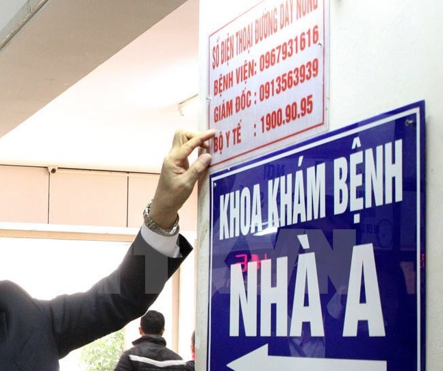 Những số điện thoại đường dây nóng được gắn tại Bệnh viện Phụ sản Trung ương. (Ảnh: TTXVN/Vietnam+) |
