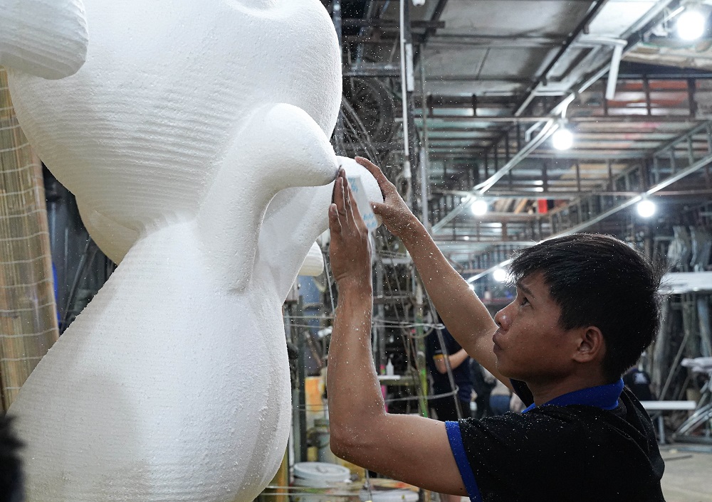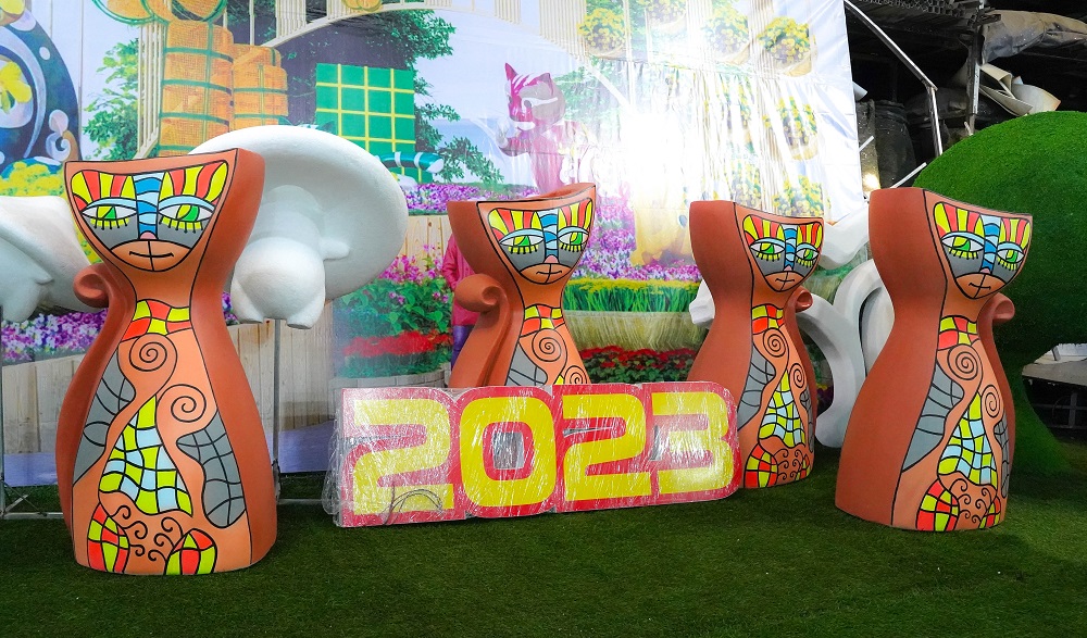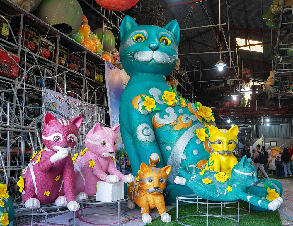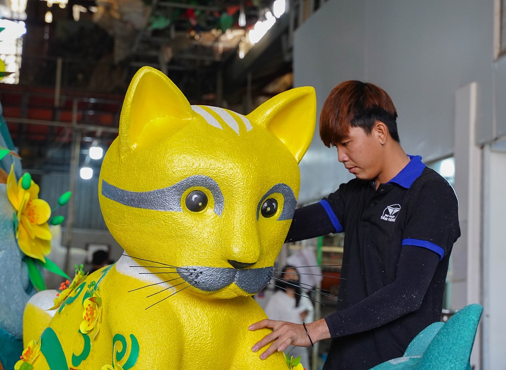 Theo ghi nhận, tại xưởng thi công của nghệ nhân Văn Tòng (Quận 12, TP.HCM), các công nhân đang gấp rút đẩy nhanh tiến độ chế tác, hoàn thiện các linh vật mèo, đảm bảo tiến độ đã đề ra. Các linh vật và tiểu cảnh của đường hoa được thiết kế hiện đại tích hợp giá trị văn hóa truyền thống đặc sắc. Hình dáng, bố cục và sự đa dạng về sắc thái biểu cảm của các linh vật, hẹn sẽ tạo nên một không gian du xuân đầy trải nghiệm cho người dân và du khách.