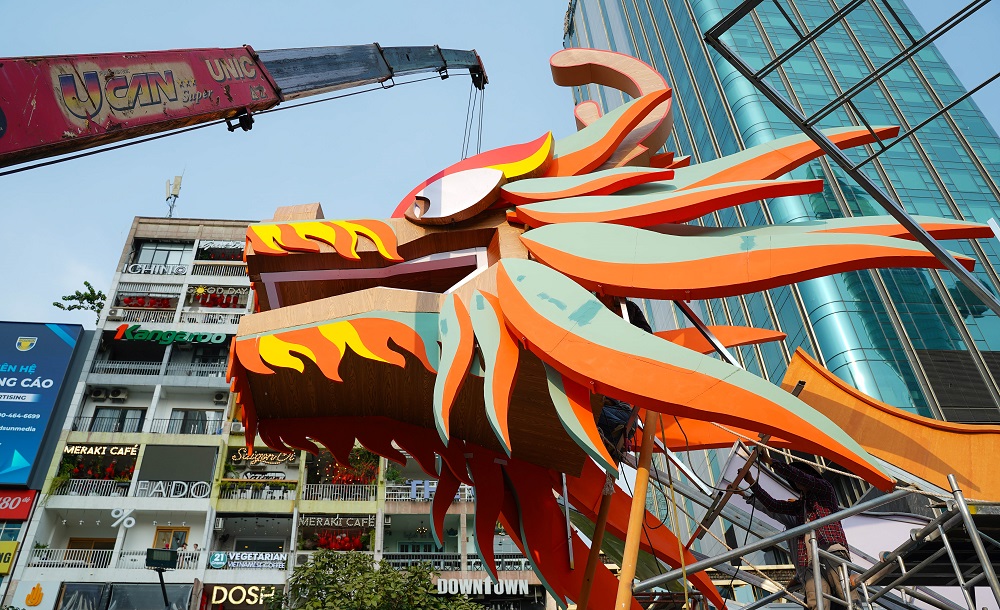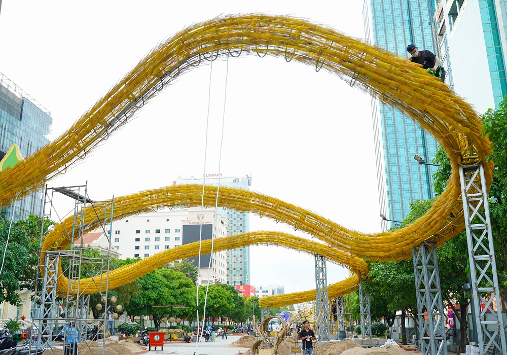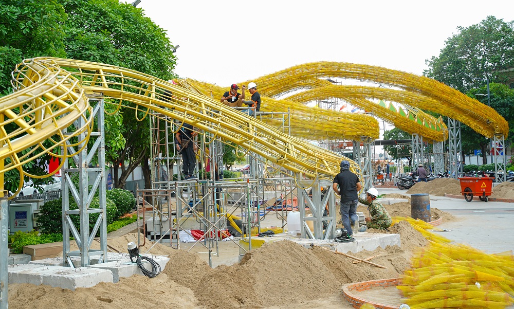 Linh vật Rồng "Nhất đại Thăng Long" với kích thước khủng dài 100m (giao lộ Nguyễn Huệ - Tôn Đức Thắng) dần thành hình với kết cấu bởi ống thép, đai thép và lưới thép.