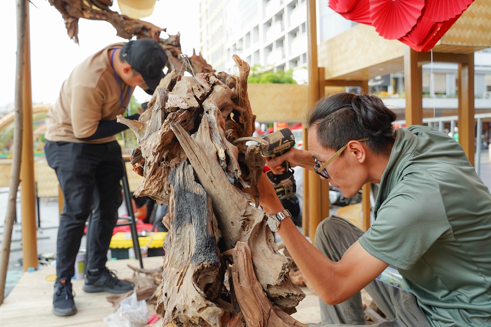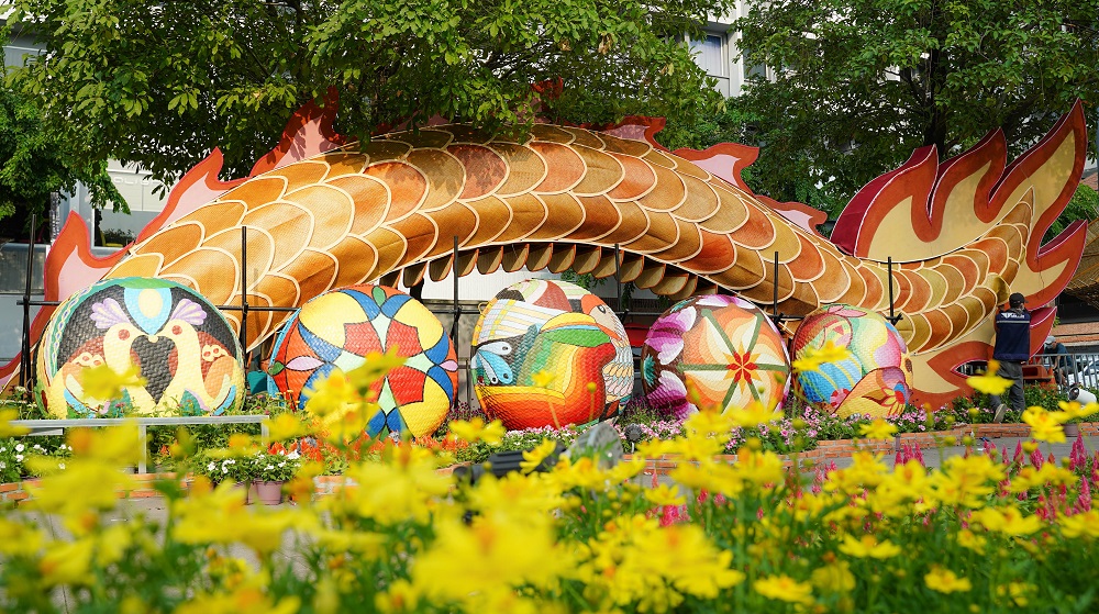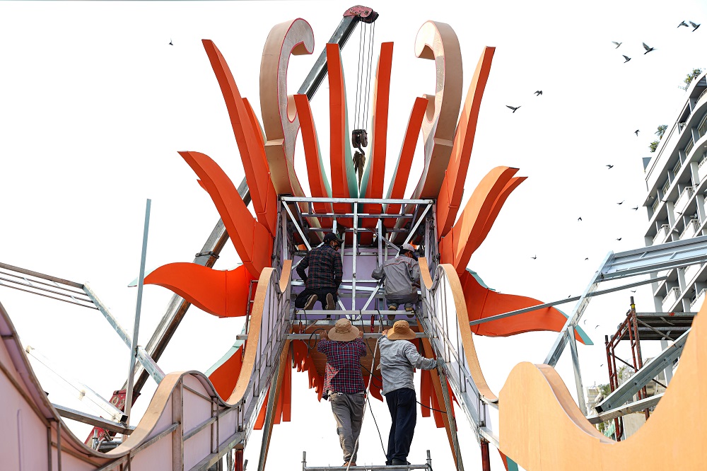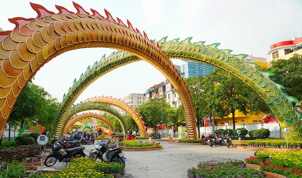 Sau hơn 10 ngày thi công, đôi linh vật Rồng chủ đạo với tên gọi "Lưỡng Long Triều Liên" đã dần hoàn thiện, đây cũng là đại cảnh lớn nhất của đường hoa năm nay.