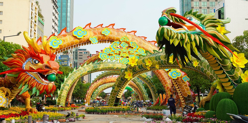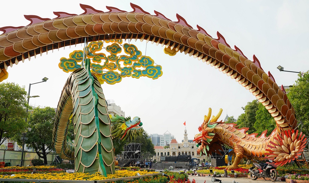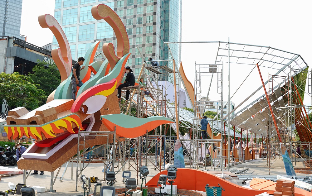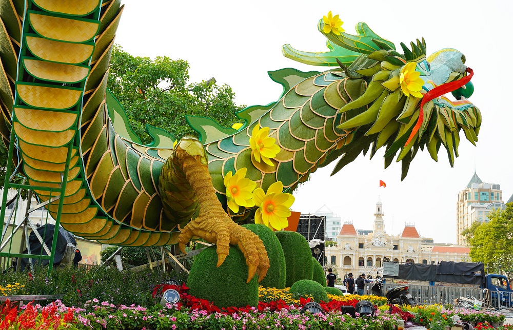 Ghi nhận của phóng viên vào chiều 1/2 và sáng 2/2 tại Đường hoa Nguyễn Huệ Tết Giáp Thìn 2024 (Quận 1, TP Hồ Chí Minh), đội ngũ công nhân, đơn vị thi công vẫn đang tất bật hoàn thiện các tiểu cảnh, trang trí hoa, thi công các hạng mục còn lại. Ngoài các linh vật Rồng chính của đường hoa, nhiều tiểu cảnh khác vẫn đang trong quá trình thành hình.