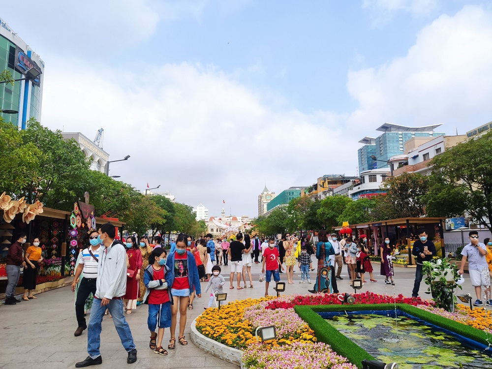 Hình ảnh du khách tham quan đường hoa Nguyễn Huệ: