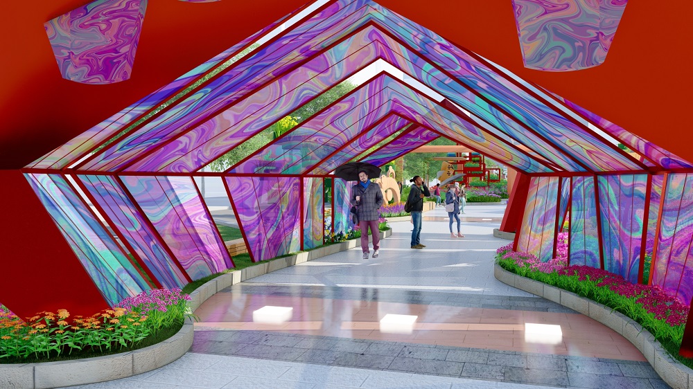 Trên chiều dài gần 17m, khách tham quan sẽ được chiêm ngưỡng vũ điệu đầy màu sắc của cầu vồng, biến hóa đa dạng không trùng lặp từ màu sắc và hình họa. Hiệu ứng phản quang xảy ra khi ánh sáng đi qua chất liệu decal hologram chạy dọc theo hệ khung hình mái nhấp nhô gợn sóng.