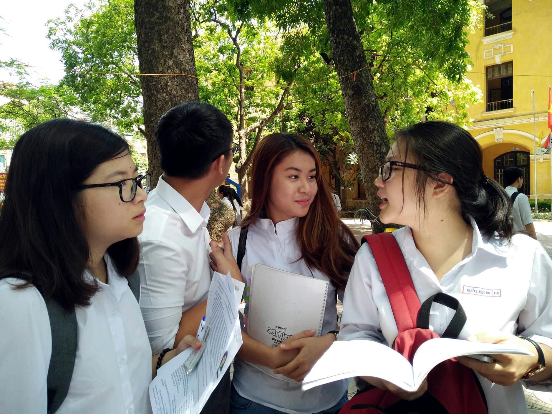 Thí sinh trao đổi bài sau khi kết thúc môn thi Ngữ văn tại trường THPT Phan Đình Phùng, Hà Nội