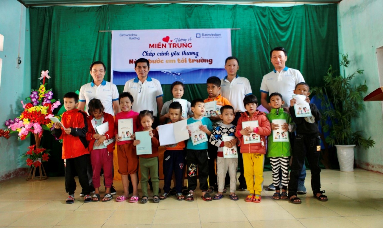 Đoàn cũng trực tiếp đến thăm hỏi, động viên 35 gia đình chính sách và các gia đình Cán bộ Nhân viên Eurowindow bị ảnh hưởng nặng nề do bão lũ tại Quảng Bình và Quảng Trị. Bên cạnh đó, Eurowindow Holding tổ chức trao tặng 100 triệu đồng cho 5 trường học trên địa bàn xã để cải tạo cơ sở vật chất cùng hơn 23.000 cuốn vở cho các em học sinh.