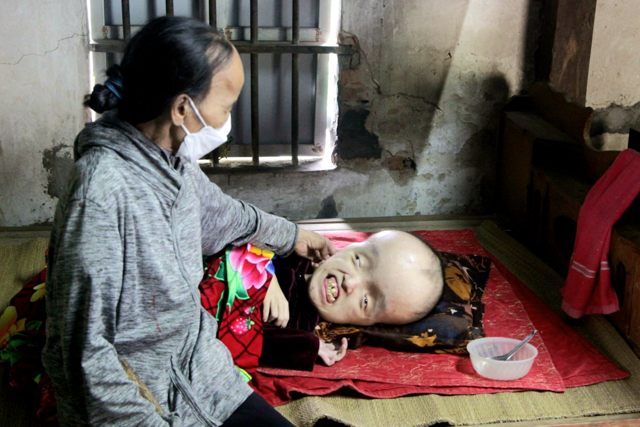 Tương tự, bà Trần Thị Hồng (SN 1956, trú thôn Lam Long, xã Xuân Hải, huyện Nghi Xuân, Hà Tĩnh) là người tàn tật, có hoàn cảnh đáng thương không kém. Đứa con gái đầu lòng sinh năm 1991 vừa chào đời đã mắc bệnh não úng thủy, cả đời sống thực vật, chưa bao giờ gọi tiếng mẹ, cha.