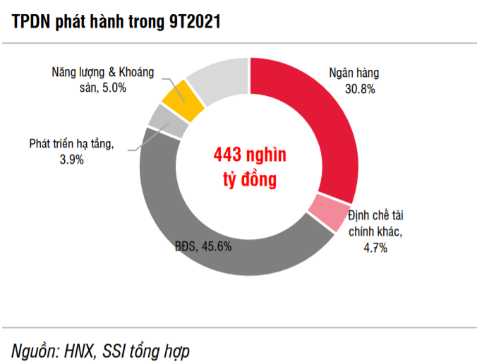 Tính chung 9 tháng năm 2021, tổng lượng TPDN phát hành là 443.100 tỷ đồng, tăng 18,6% so với cùng kỳ 2020. Trong đó, quán quân phát hành vẫn là các doanh nghiệp bất động sản với 201.900 tỷ đồng (chiếm 45,5%); sau đó đến các ngân hàng với 136.400 tỷ đồng (chiếm 30,8%); năng lượng và khoáng sản với 21.900 tỷ (chiếm 5,0%)...