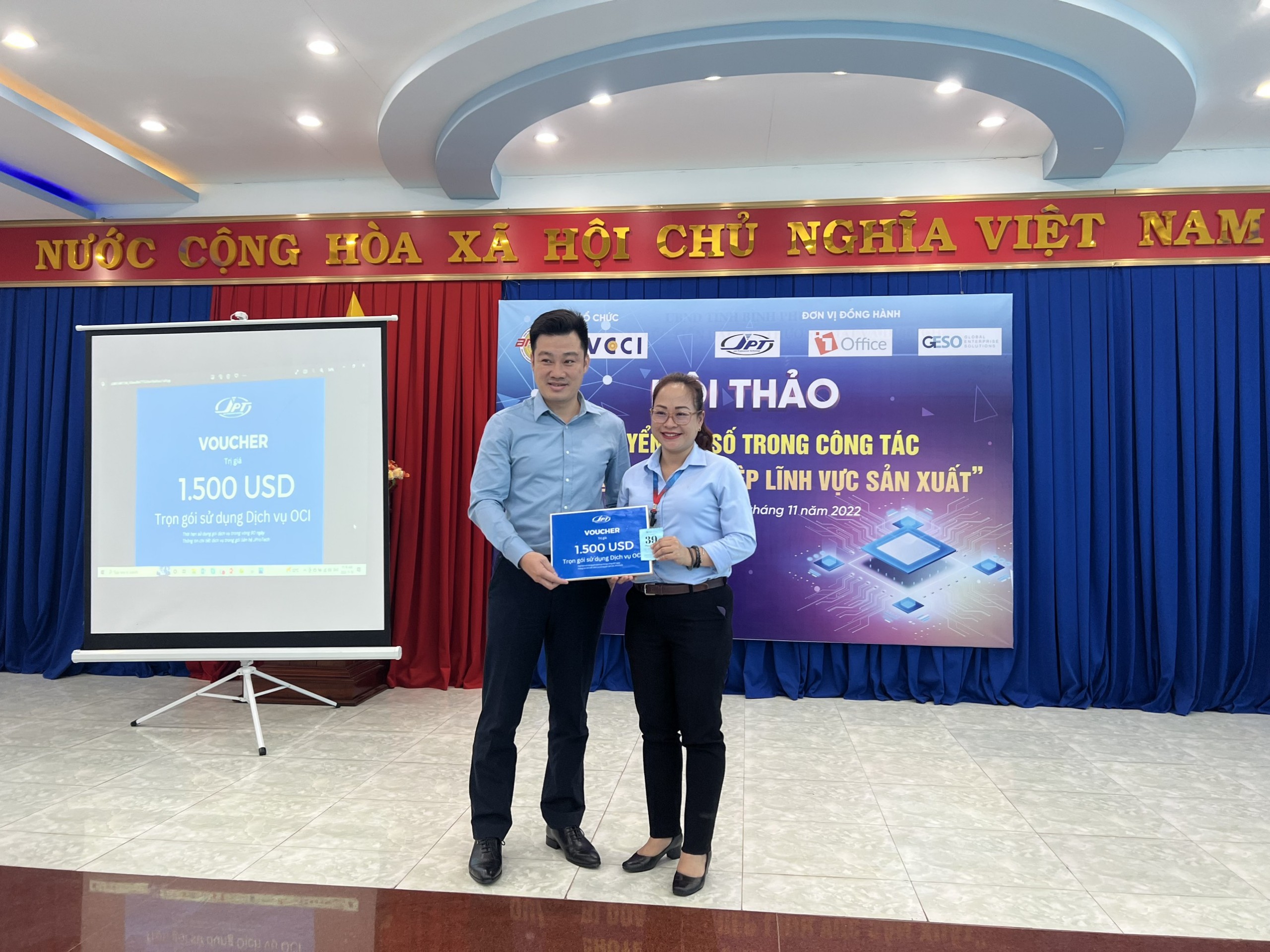 Ông Nguyễn Thanh Tùng - Giám đốc Tư vấn Giải pháp Công ty TNHH Công nghệ JProTech (trái) tặng doanh nghiệp 1 voucher gói sử dụng Dịch vụ Cloud OCI trị giá 1.500 USD, thời hạn sử dụng gói trong vòng 90 ngày.