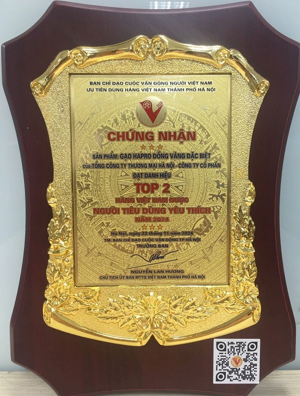 Chứng nhận sản phẩm Gạo Đồng Vàng đặc biệt của Hapro Đồng Tháp, đạt TOP 2 Hàng Việt Nam được NTD yêu thích năm 2024