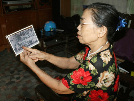 | Bà Thao xúc động lần dò khuôn mặt từng đồng đội cũ đã hy sinh tại Ngã ba Đồng Lộc |
